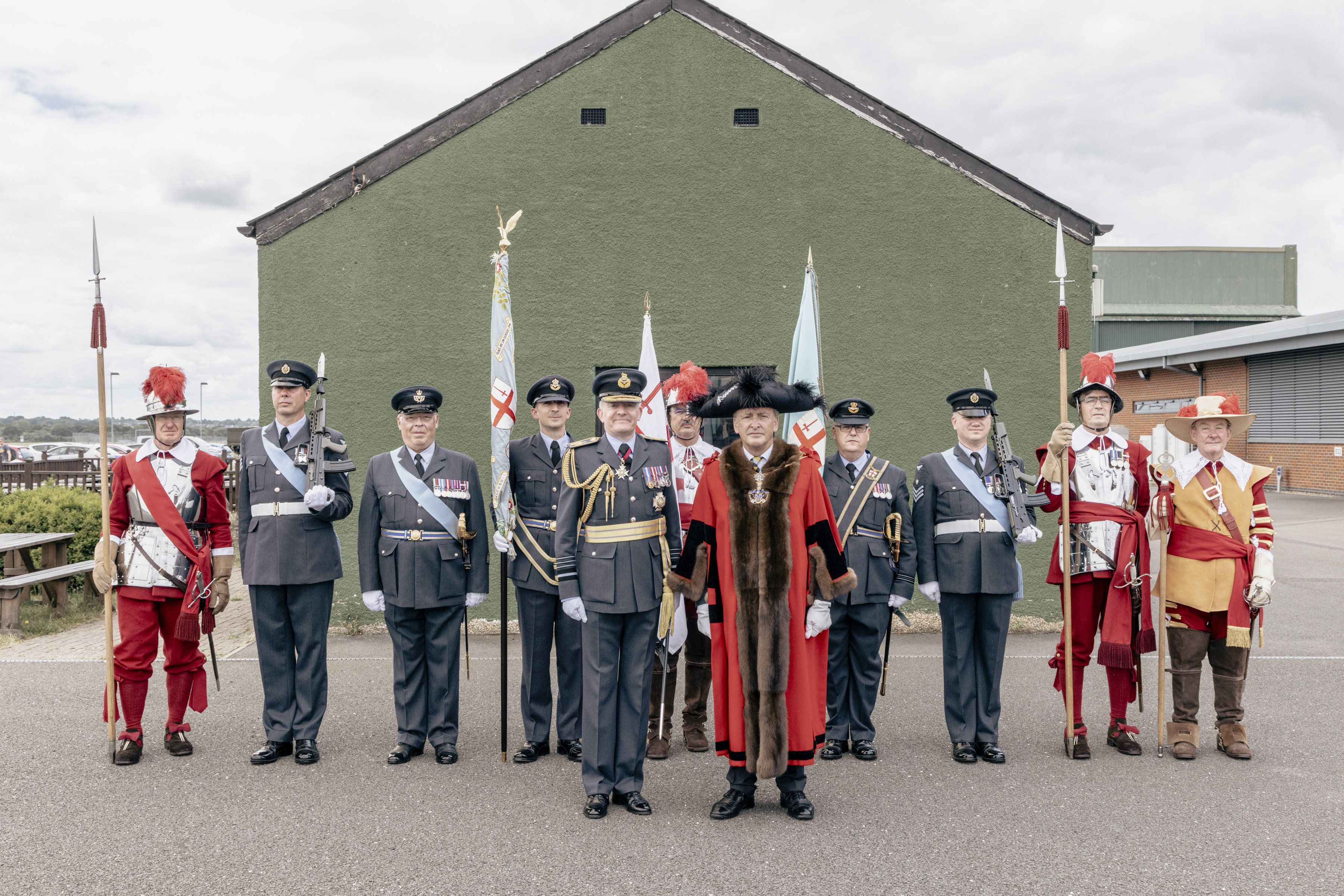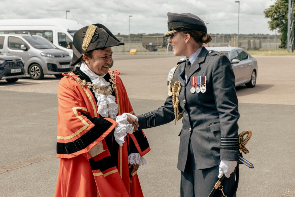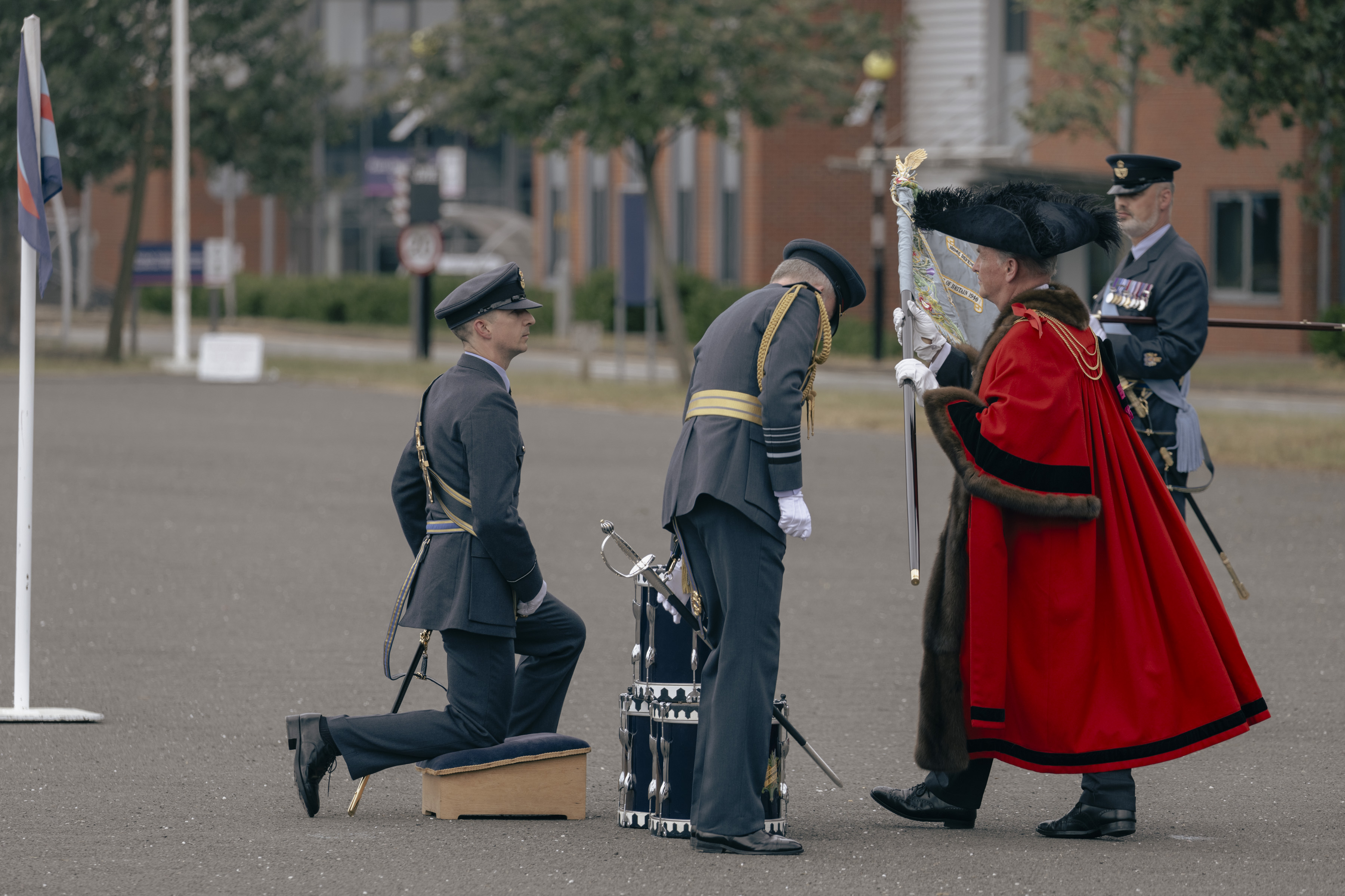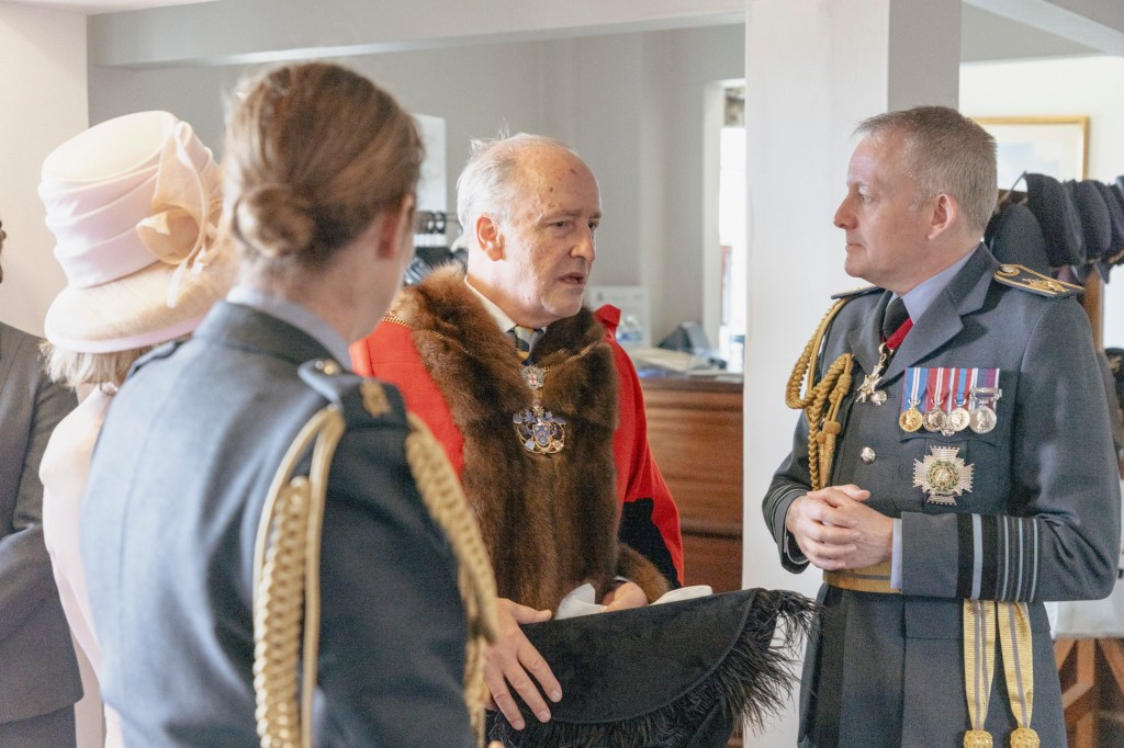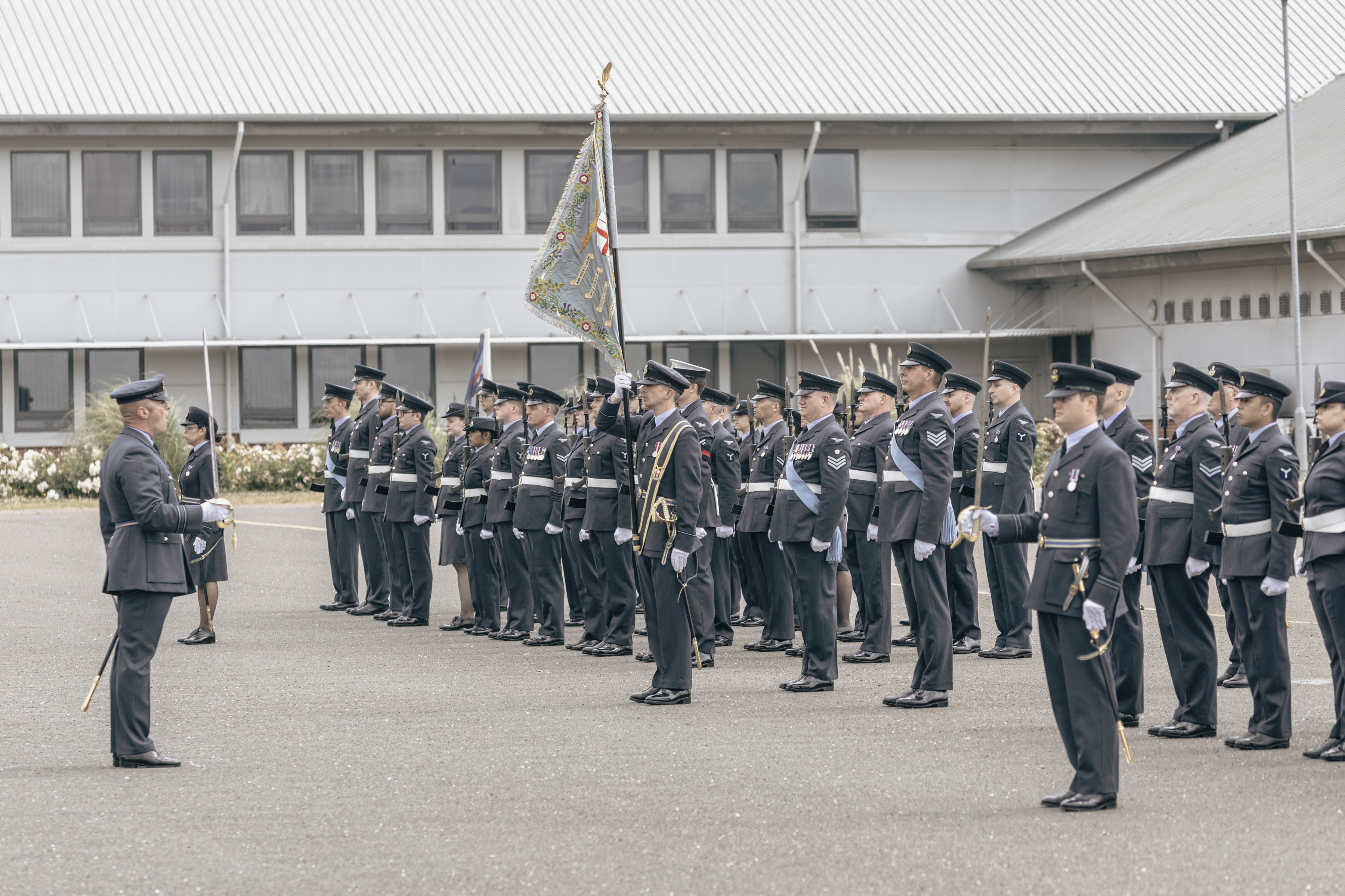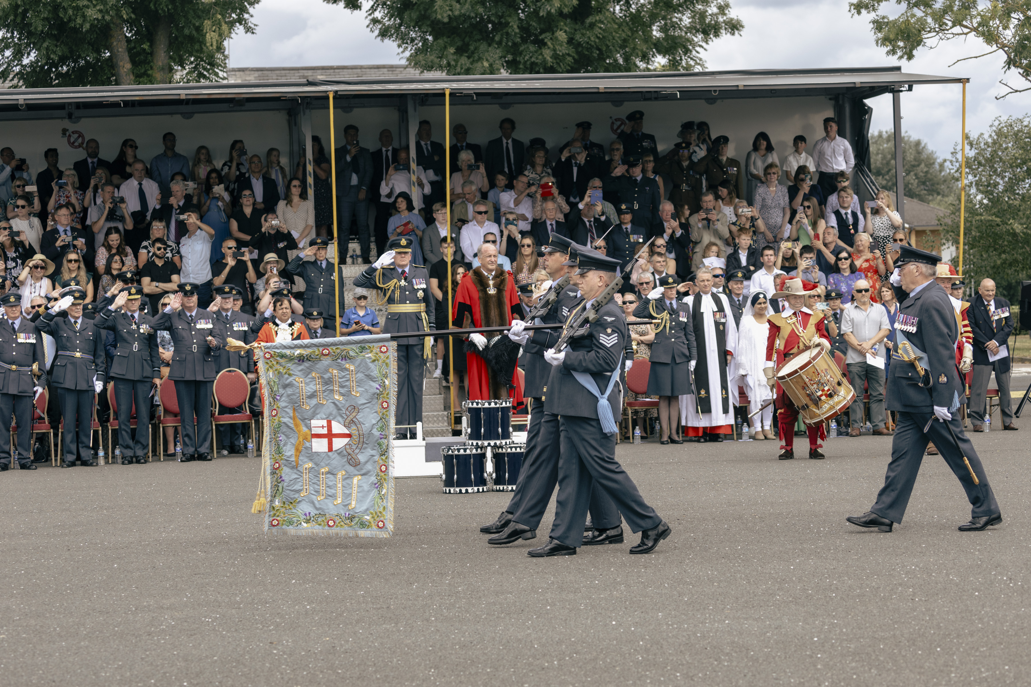 24 June 2023, RAF Northolt – In a parade held at RAF Northolt by 600 (City of London) Squadron, the Representative Lord Mayor of the City of London, Sir Charles Bowman KStJ JP, accompanied by the Chief of the Air Staff, Air Chief Marshall Sir Rich Knighton KCB ADC FREng, has presented a new Royal Auxiliary Air Force Standard to the Squadron.